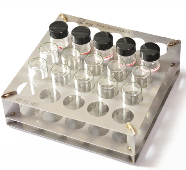 在整个检测过程中,需要用到若干个样品瓶和试样检测瓶。它们的个头都不大,而且是玻璃材质,又是存放的液体溶液,因此只要操作人员稍有不慎,就可能发生倾覆和破损,为此,我们专门设计了不锈钢材质的样品瓶架,用于在检测过程中放置样品瓶和试样检测瓶,充分体检了人性化设计。